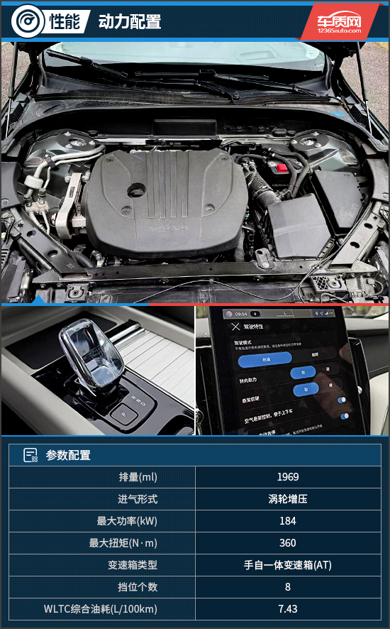 动力系统方面,评测车搭载2.0T涡轮增压发动机+48V轻混系统,最大功率184kW,最大扭矩360N·m。与之匹配的传动系统为8速手自一体变速箱,并配备多片离合器式全时四驱系统。