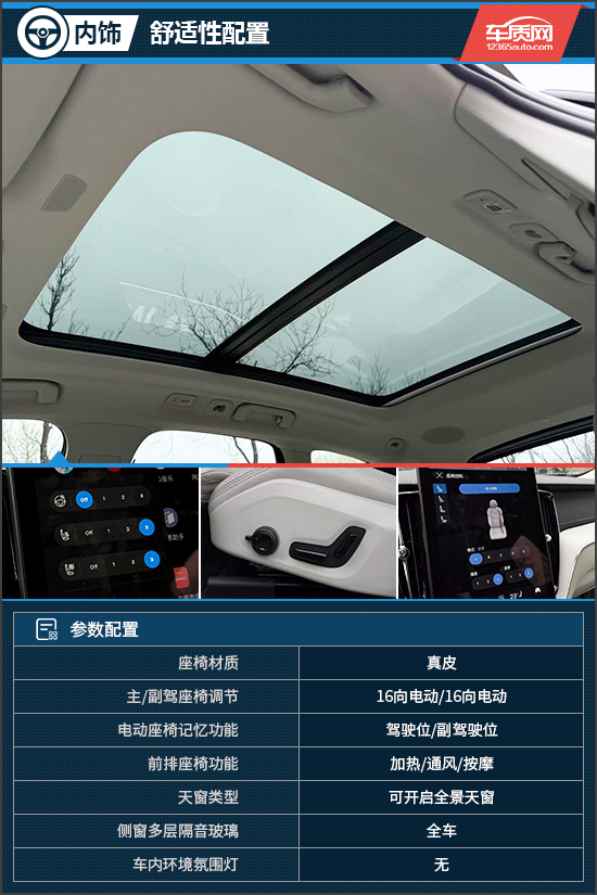 舒适性配置方面,前排人体工程学座椅支持多向电动调节、腰部支撑及座垫延伸,提供更为舒心的乘坐体验。可开启全景天窗采用深色夹层玻璃,有效减少眩光与外部噪音,遮阳帘可设置为当车内温度升至25摄氏度时自动关闭,确保乘坐舒适。此外,车内还装配了双效增强型空气净化系统,可高效过滤95%的PM2.5颗粒物,去除高达97%经空气传播的病毒和99%的花粉,让车内时刻保持清新洁净。