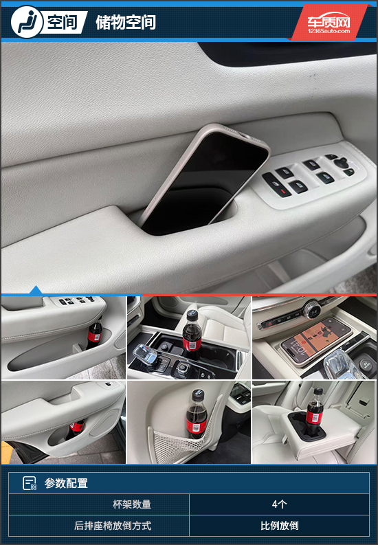 储物空间方面,中控台前方设有无线充电面板,打开后方盖板,可见一个储物槽及两个带限位器的杯架,能够满足日常使用需求。此外,四个车门把手均采用封底设计,能够当做储物槽使用,提升了空间利用率。