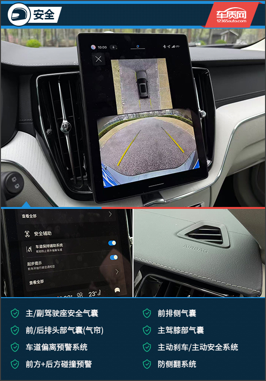安全配置方面,评测车提供了丰富的主动和被动安全配置,如主驾膝部气囊、主动刹车/主动安全系统、前方+后方碰撞预警以及防侧翻系统等功能均有配备,能够为通勤或远游提供周全的安全防护。