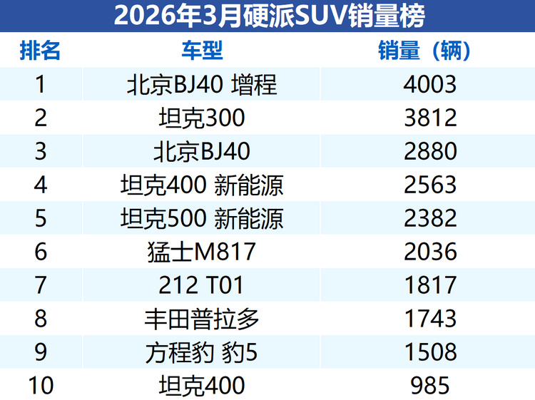 而除了前五名的车型外,3月份榜单前十名的硬派SUV还包括猛士M817、212 T01、丰田普拉多、方程豹豹5以及坦克400燃油版,这其中只有猛士M817销量突破了两千台,其他车型月销大多只有一千多辆,第十名的坦克400只卖出985辆。