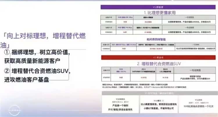 第二个细节:被曝光的东风日产内部培训材料上白纸黑字写着——"向上对标理想,增程替代燃油""比理想更懂家用"。市场部NX8沟通群里也有明确要求:输出NX8与理想i6、问界M7的对比表格,"这种就能直接传递信息"。