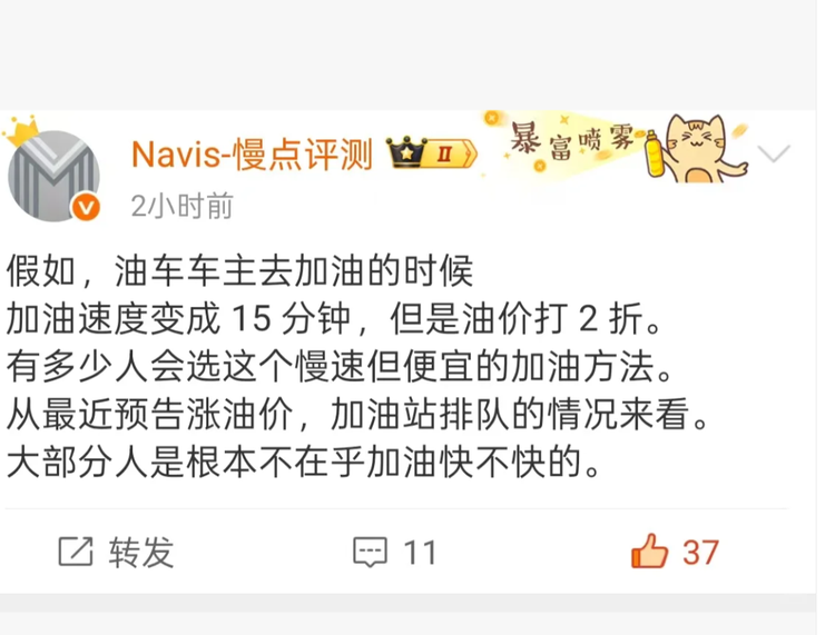 从最近油价上调引发加油站排队的现象来看,这个逻辑更站得住脚。油价上涨时,车主们会选择排队加油,即便耗时增加,也不愿承担更高的用车成本;可当主动提供 “慢 15 分钟 + 油价 2 折” 的选项时,多数人却选择拒绝。这充分说明,车主对价格十分敏感,但对 “时间成本与使用体验” 的重视程度更高。大家可以接受偶然的排队,也能接受合理的价格波动,却难以接受主动牺牲时间换来的优惠,这种不可逆的时间损失,远非差价所能弥补。