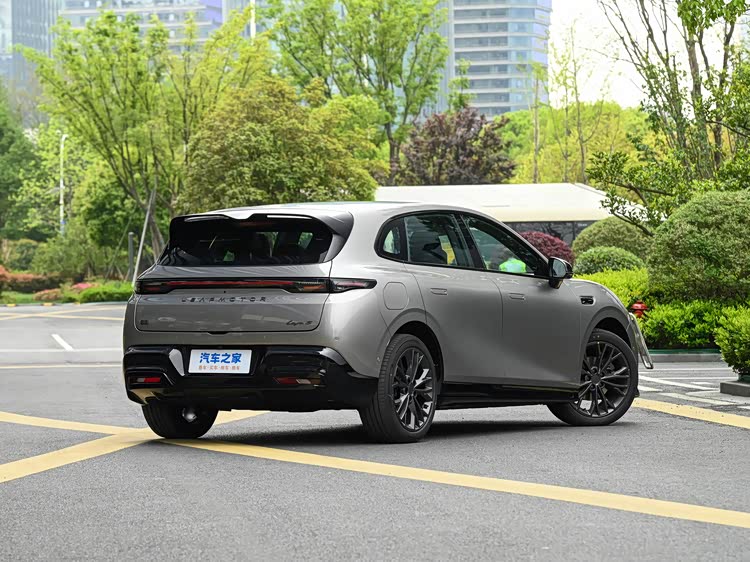 侧面造型方面,车顶带着明显的弧度,有那么点小溜背风格,圆润的腰线采用了贯穿式设计,点缀出了车身侧面的层次感;门把手则是弹出式造型,能够起到降低风阻的作用;轮眉和侧裙部分设计有隆起的筋线,轮毂则是熏黑的多幅式造型,而且配备的是19英寸轮毂。