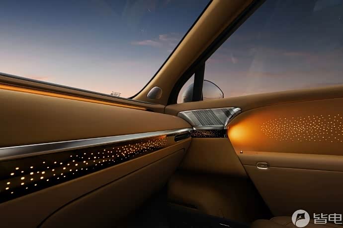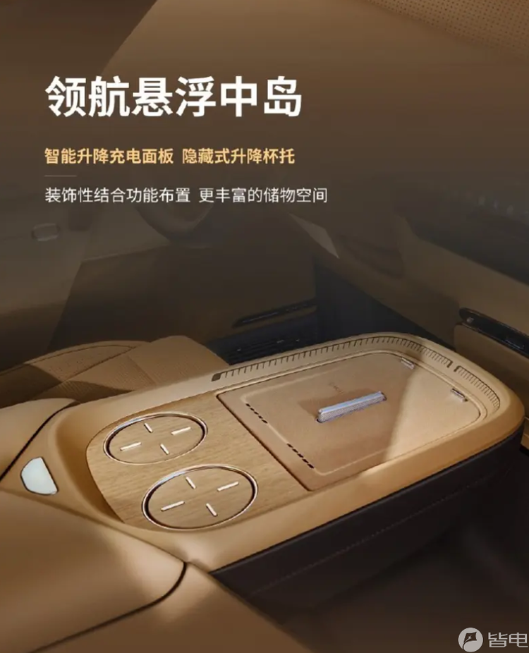 前排中央通道区域采用领航悬浮中岛设计,配备可升降充电面板与隐藏式升降杯架,储物空间更为实用。车门内饰板采用星绒透光皮革材质,搭配灯带式氛围灯。