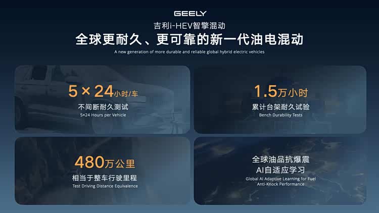 多年来,吉利始终以严苛标准坚守产品可靠性,为全球用户打造更耐久、更可靠的高价值产品,这一理念也同样贯穿i-HEV智擎混动技术的开发全过程。依托全球最极限验证体系,吉利对i-HEV智擎混动累计开展了1.5万小时的台架耐久试验,相当于整车行驶里程约480万公里,比传统混动标准高出20%以上;还通过AI自学习方式,让发动机自适应全球不同油品的抗爆性指标,确保i-HEV智擎混动产品在全球任一地区都能安全高效行驶。