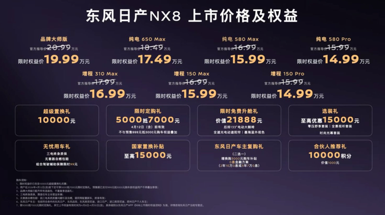 东风 日产NX8(参数|询价)正式上市,新车推出7款配置车型,限时权益价14.99-17.49万元。另外官方还推出NX8品牌大师版,限时权益价19.99万元,同时还推出包含10000元置换礼在内的7种福利。
