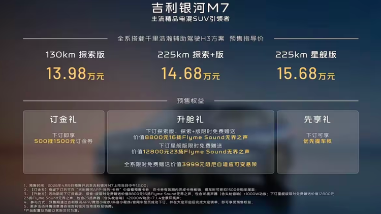 吉利 银河M7(参数|询价)正式开启预售,共推出三款配置车型,预售区间为13.98-15.68万元。作为一款主打家庭城市SUV,新车聚焦续航、用车成本及智能安全三大核心痛点。据官方透露,新车将在月底上市,五一前开启首批交付。