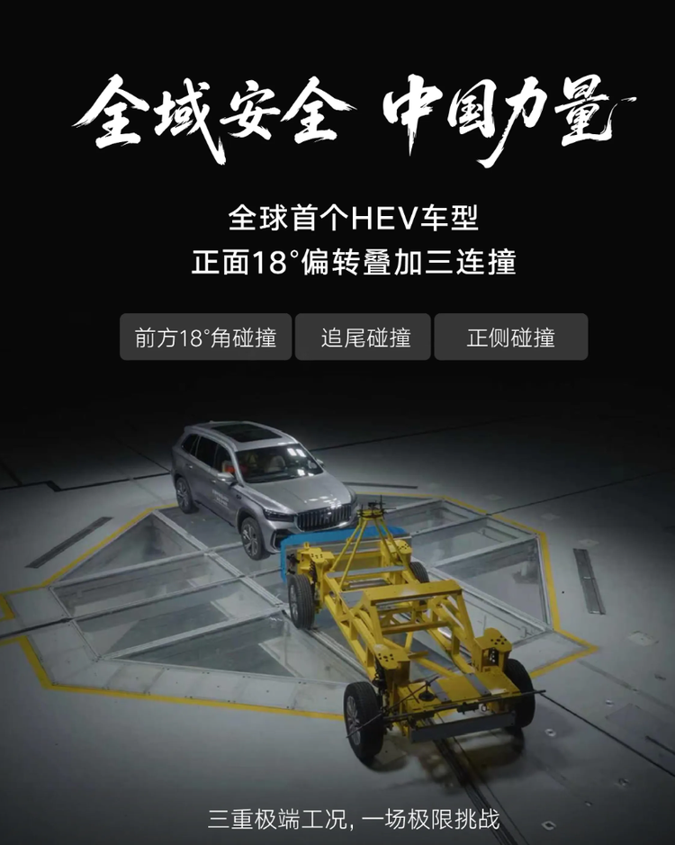 吉利i-HEV智擎混动在研发验证阶段,就主动选择了这个18°的“魔鬼角度”来挑战自己。在一次公开的测试中,一台星越L i-HEV以60km/h的速度,成功通过了全球首个HEV车型正面18°偏转,并叠加后部和侧面的三连撞测试。为什么18°角如此危险?因为在这个角度下,碰撞冲击力很难被车头前方的防撞横梁和吸能盒有效吸收和分散。冲击力会产生更强的侧向挤压,容易推动发动机、前车架甚至轮胎侵入乘员舱,对车内人员形成二次挤压伤害。