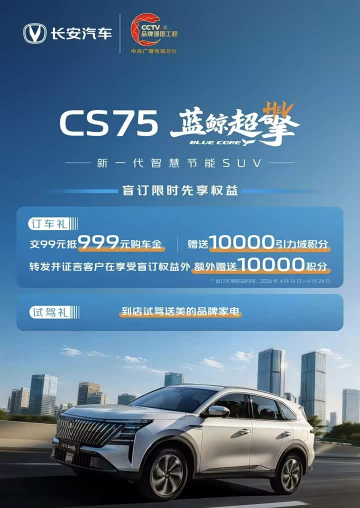 4月14日,长安汽车正式宣布,旗下紧凑型SUV 长安CS75PLUS(参数|询价)蓝鲸超擎版开始接受盲订。对于提前预订的用户,长安提供了一系列礼遇,包括试驾赠送美的品牌家电、支付99元抵扣999元购车金、以及10000引力域积分。如果客户在社交平台分享提车体验,还能再获得10000积分。具体活动细则以引力域App公布为准。这款新车计划在4月24日开幕的2026北京车展上首次与公众见面。