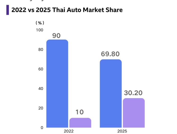 最近4年,日本车在泰国市场份额降至69.8%,首次跌破70%。