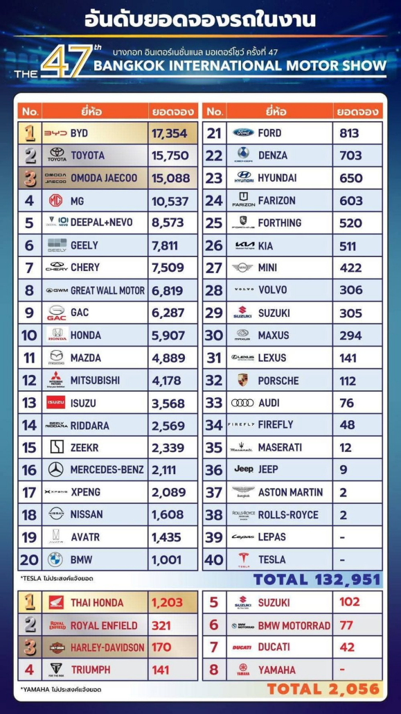 但在今年泰国车展上,比亚迪以 1.8万辆的成绩,直接把老牌霸主丰田(1.57 万辆)挤到了第二。
