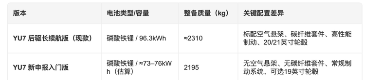 至于减配内容,其实主要集中在电池部分,核心核心安全和智能配置并未缩减,具体减配细节的是:一是电池容量缩减,从标准版的96.3kWh缩减至73kWh左右,这也是减重115kg的主要原因,对应的续航从标准版的835km降至620km左右,但完全能满足日常城市通勤和中短途自驾需求;二是车身轻量化优化带来的细节精简,比如采用轻量化座椅、简化非必要内饰结构,同时使用高强度铝合金部件辅助减重,不过2200MPa超强钢车身等核心安全结构并未改动;三是部分可选配置的调整,标准版部分默认配置在低配版中可能变为选装,但核心配置均有保留。值得注意的是,激光雷达、4D毫米波雷达、小米澎湃OS车机系统、56英寸HUD等核心智能配置均未减配,甚至转向尾灯升级为YU7 GT同款,还新增19寸低风阻轮毂等可选方案,整体属于“减续航、轻优化,不减核心配置”的合理调整,而非盲目减配。
