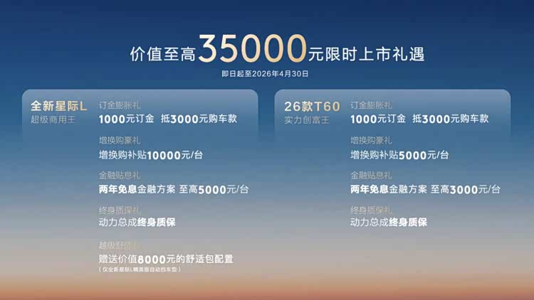 上汽大通全新星际L、2026款T60、26款 星际EV(参数|询价)三款车型在成都区域上市,全新星际L售价10.88-15.98万元,2026款T60售价7.98-10.18万元,2026款星际EV售价24.98万元。至4月30日,星际L、2026款T60下订用户能享受1000元抵3000元购车款、5000/10000元增换购补贴等5重上市礼遇,综合权益至高3.5万元。值得注意的是,三款新车还享受行业首创的7天免费试用服务,消费者可以深度体验后,再决定是否购买。