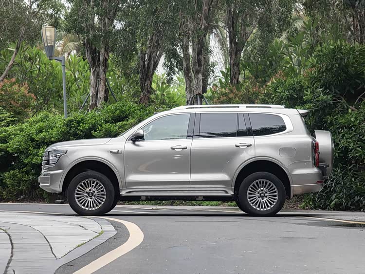 再来看车身侧面部分,车身侧面依旧保持着坦克500经典的硬朗造型,肌肉感十足的腰线从前翼子板贯穿至车尾,搭配大尺寸厚壁轮胎与较高的离地间隙,将硬派SUV的气场拉满。车身尺寸为5078mm×1934mm×1905mm,轴距达2850mm,修长的车身与宽大的轮距,既保证了内部空间的宽敞,也为越野行驶提供了良好的稳定性。顶配车型专属的"敦煌绿"车漆,低调中透着高级感,进一步提升了车型的辨识度。