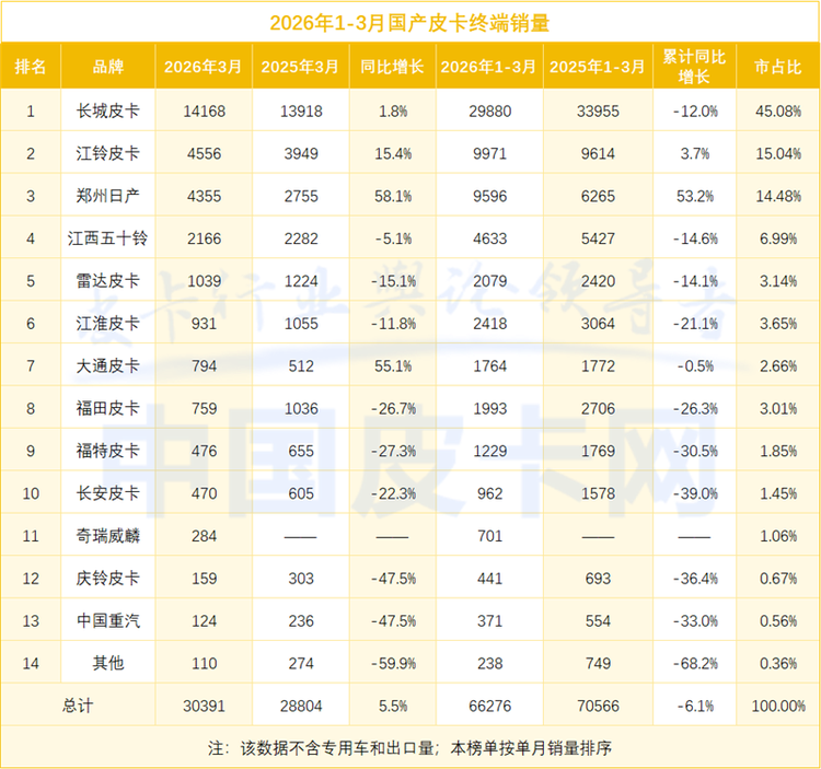 在经历了春节淡季低谷后,3月,国内皮卡市场迎来了久违的强势反弹——当月终端销量达到30391辆,同比增长5.5%,环比2月暴增101.6%。而从一季度整体来看,国内市场1-3月累计销量66276辆,虽然同比仍然下降6.1%,但主要是受2月的低迷表现拖累,3月的回暖为二季度市场走势释放了积极信号。