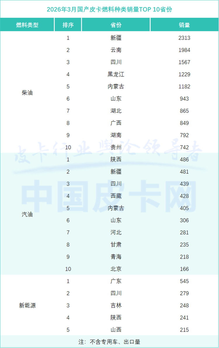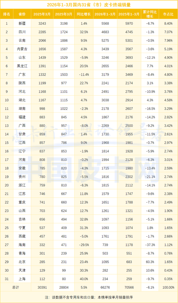 区域市场方面,西部和边疆省份依然是皮卡消费的核心阵地。新疆以3243辆的销量蝉联榜首,四川、云南分列二三位,三省合计占全国销量近四分之一。值得注意的是,四川3月销量同比增长32.5%,增速领跑全国,基建和农业季节性需求旺盛是主要驱动力。
