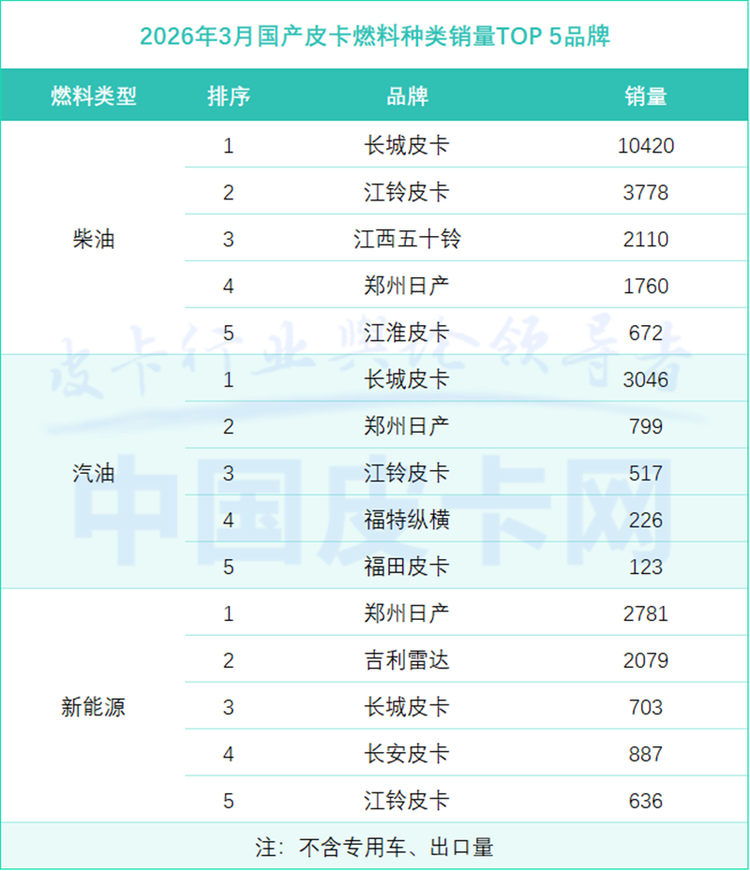 在动力结构上,柴油皮卡3月销量20791辆,占比68.4%,仍是市场绝对主力,但份额持续下滑趋势未改。新能源皮卡3月销量4203辆,渗透率提升至13.8%,创单月历史新高。值得一提的是,新能源皮卡销量的大幅提升与国家电网等企事业单位年初集中采购紧密相关,不过,从2022年占比不足1%,到2026年突破10%,新能源皮卡市场份额的跨越式增长,彰显出了巨大的消费潜力。其中,广东、四川、吉林成为新能源皮卡销量前三省份,郑州日产、吉利雷达、长城皮卡则占据品牌销量前三甲,电动化已从概念验证进入规模化普及阶段。