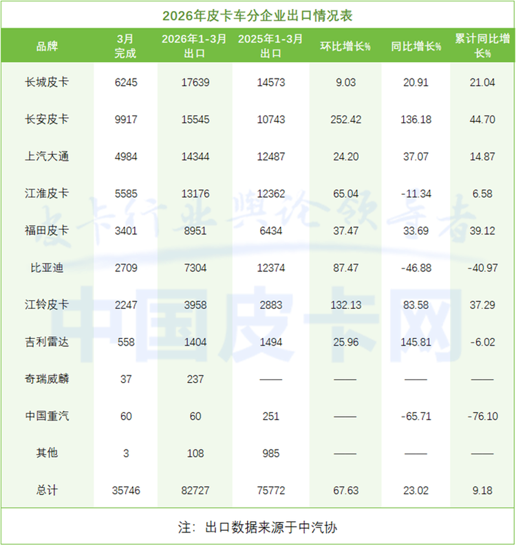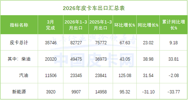 出口市场继续扮演增长引擎角色。3月皮卡出口35746辆,同比增长23%,环比增长67.6%,一季度累计出口82727辆,同比增长9.2%。目前,皮卡出口占比持续超过国内销量,成为行业重要的增长极。