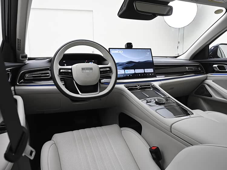 内饰方面,银河星耀7将传统豪华与现代科技进行了很好的融合,整个座舱用料采用了大量皮质软包以及亮黑色钢琴烤漆饰板,并且在中央通道区域使用了水晶旋钮,档次感营造的极为到位。