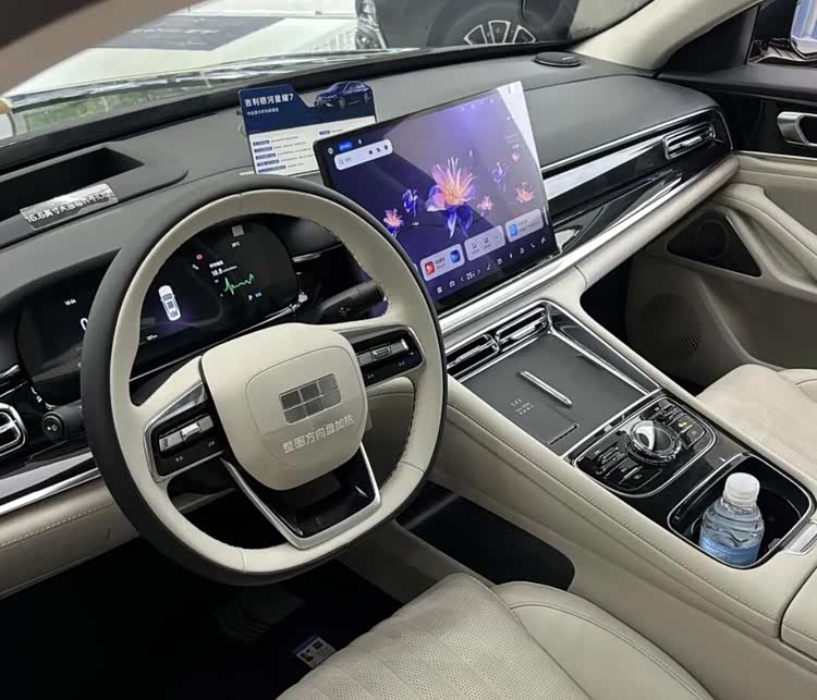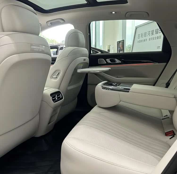 坐进车里,典型的新能源设计风格,配备悬浮中控屏、弧形液晶仪表与HUD,搭载银河Flyme Auto 2系统,车内取消了不少物理按键,仅在中岛、方向盘上有所搭载。车内采用大面积软质材料包覆,看起来相当上档次。配置上,四座均支持通风、加热、按摩,后排带触控扶手、折叠小桌板,配合16扬声器音响、全景天窗,舒适性上可以相信国产车。