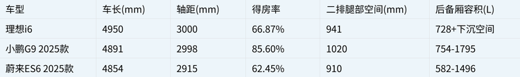 横向对比来看,小鹏G9 2025款轴距为2998mm,车身尺寸4891×1937×1670mm ,在纵向空间上略逊于理想i6。智己LS6 2025款的具体轴距数据虽未在搜索结果中完整呈现,但根据其SUV定位及701-802km的续航配置 ,其空间表现应处于同级主流水准。蔚来ES6 2025款轴距数据未在搜索结果中明确列出,但其4854mm的车长相对紧凑,后排腿部空间为910mm ,更注重城市通勤的灵活性。