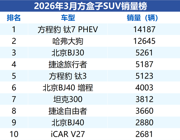 除前五名外,其余方盒子SUV的3月销量均未突破5000台,上榜车型还包括北京BJ40增程版、坦克300、捷途自由者、北京BJ40燃油版以及iCAR V27。值得关注的是,第十名的iCAR V27在今年3月13日才正式上市,在未满一个完整销售月的情况下,便斩获2681辆销量并跻身前十,足以看出这款新车的市场热度与认可度。