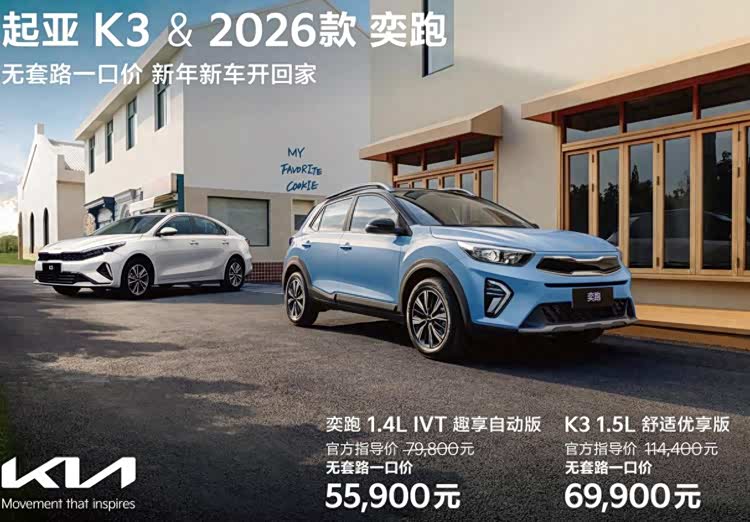 自开年以来,K3和2026款 奕跑(参数|询价)双车一口价政策一经推出,便快速引爆市场,统一定价、透明消费、标准服务的购车模式,为消费者创造了更省心、更安心的购车体验。为了回馈广大消费者的支持与信赖,悦达起亚4月将重磅延续双车一口价政策,2026款起亚奕跑1.4L IVT趣享自动版55900元、起亚K3 1.5L舒适优享版69900元,同时叠加多重购车权益,让消费者以更低门槛享受高品质好车。