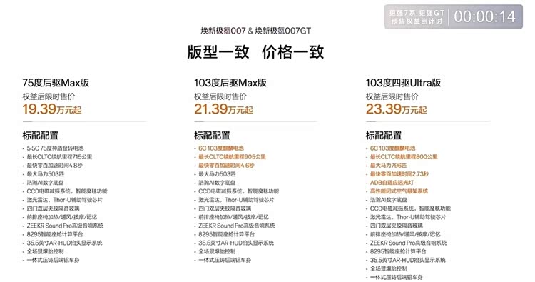 4月10日,焕新极氪007和焕新 极氪007GT(参数|询价)正式上市,其中,焕新极氪007/007GT上市权益后限时价格均为19.39-23.39万元。与此同时,极氪品牌五周年之际还推出了限定版本——极氪001五周年纪念版也正式开启限量发售,售价为36.5万起。