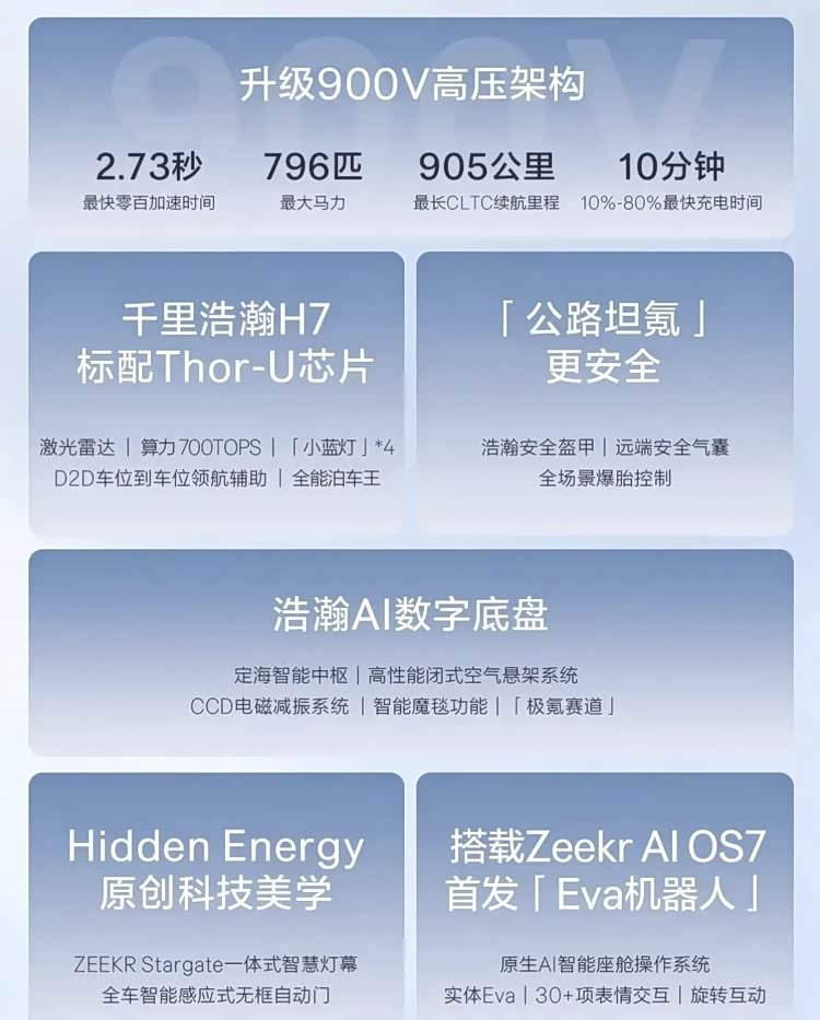 新车还围绕年轻用户的个性化需求,在座舱上有了持续的创新,其中升级了ZEEKR AI OS7系统,有8295芯片坚持,流畅度、功能丰富度全面升级,首发“Eva机器人”,支持30+项灵动表情与多场景交互,让座舱更具趣味和温度。
