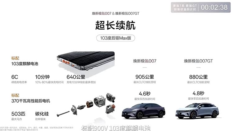 此外,两车均搭载了103度麒麟电池和75度神盾金砖电池,分别支持6C超快充和5.5C快充,SoC从10%充至80%最快分别需要10分钟和10.5分钟。焕新极氪007 CLTC最长续航里程为905km,焕新极氪007GT CLTC最长续航里程为880km。