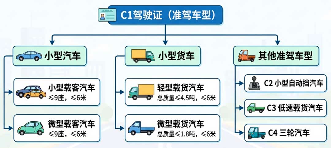 ✅ C1 = 普通家用车 + 小型蓝牌车。