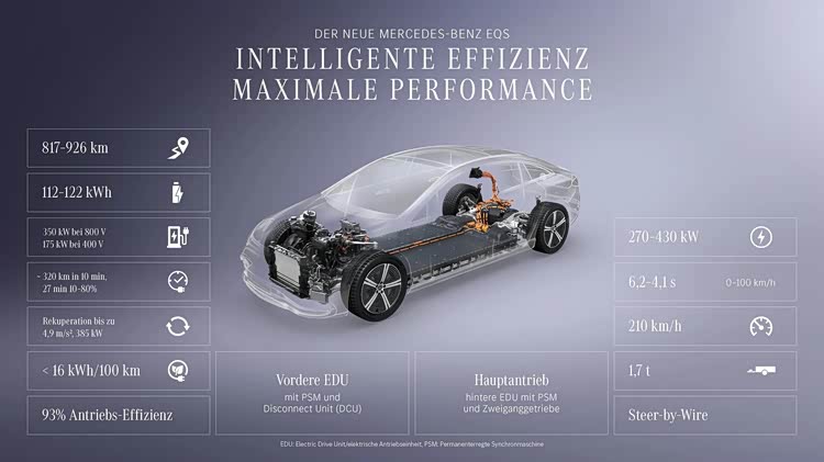 电动车最大的要点之一就是续航和充电,从新车来看,奔驰明显是听劝的,毕竟高傲和自大是不能带来销量和利润的。新车目前已确认将推出四款配置,分别是EQS 400、EQS 450+、EQS 500 4Matic、EQS 580 4Matic,其中后三款均采用了800伏架构和122kWh的电池组,入门级的400则采用了400伏架构以及112kWh的电池组。