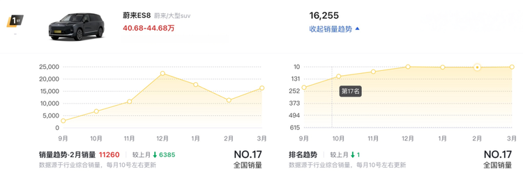 乘联分会公布的3月大型SUV销量榜里, 蔚来ES8(参数|询价)以16255辆继续排在第一。更夸张的是,这已经不是它第一次坐上这个位置,而是连续四个月稳居榜首。