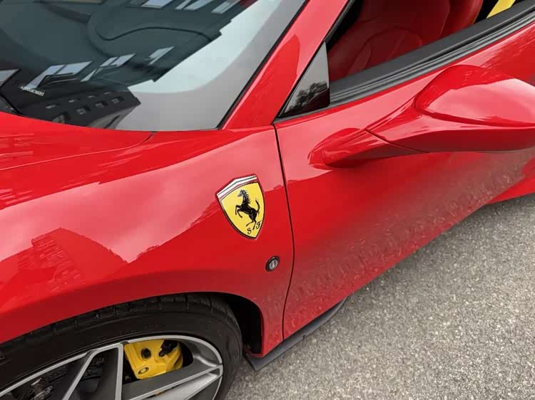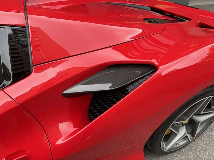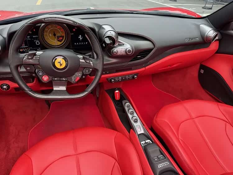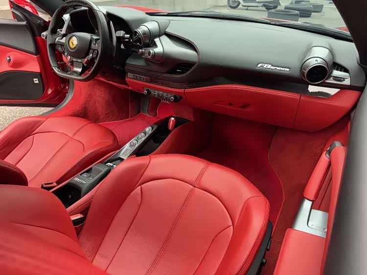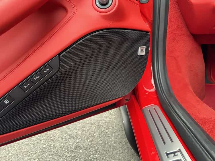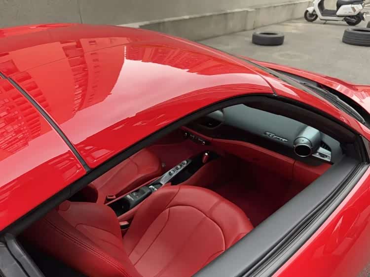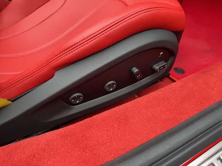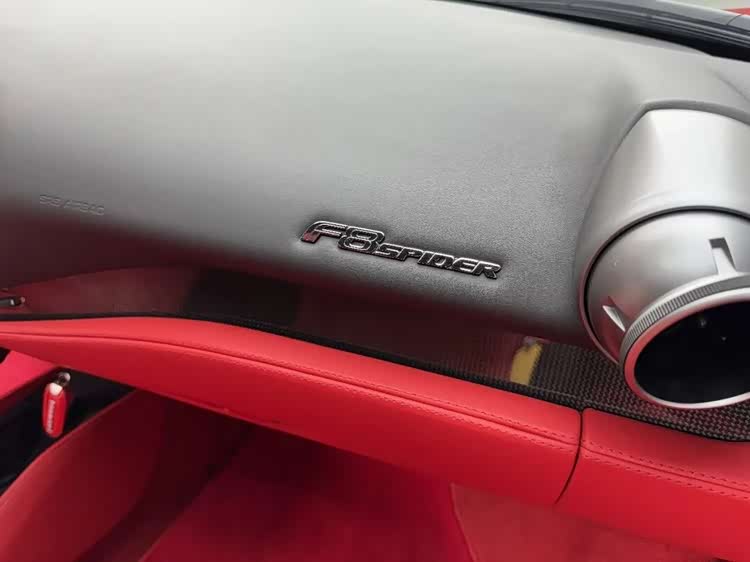 铺垫了这些信息,来看看最近拍到的这辆红色F8 Spider。车漆不出意外,仍然是经典的赛车红Rosso颜色,内饰是Rosso Ferrari,地毯颜色也是Rosso,可以说配色方案是比较常见,但也是不容易出错的选择。