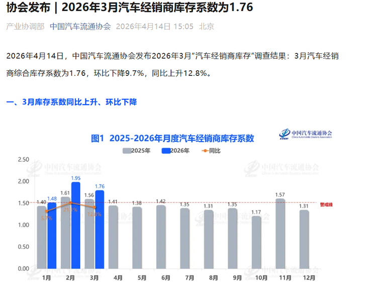 中国汽车流通协会4月14日发布的“汽车经销商库存”调查结果显示,2026年3月汽车经销商综合库存系数为1.76,虽环比下降9.7%,但同比仍上升12.8%。这一数字虽较二月有所改善,但远远未触及0.8至1.2的合理区间。
