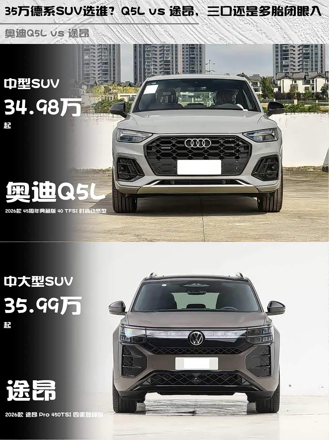 最近在纠结 奥迪Q5L(参数|询价) 2026款 45周年典藏版和途昂 2026款 Pro 450TSI四驱登峰版的朋友看过来!作为深度体验过两台车的“老司机”,来聊聊这两台德系SUV的差异化表现👇