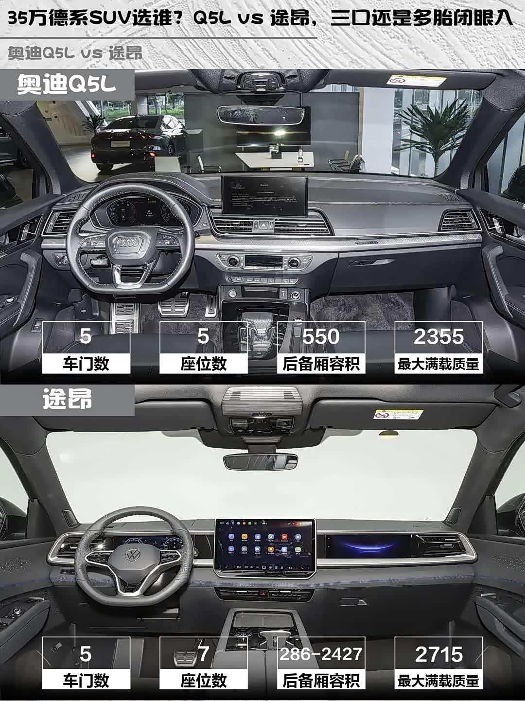 途昂Pro的5158mm车长+7座布局确实碾压级存在,第三排能正经坐成年人,后备箱放倒秒变1.8米大床。但Q5L的2945mm轴距更懂国人——后排腿部空间奢侈到能跷二郎腿,后备箱550L容积装露营装备毫无压力。实测途昂满载时储物格更丰富(门板能塞4瓶水!),但Q5L的电动尾门带脚踢感应更优雅。