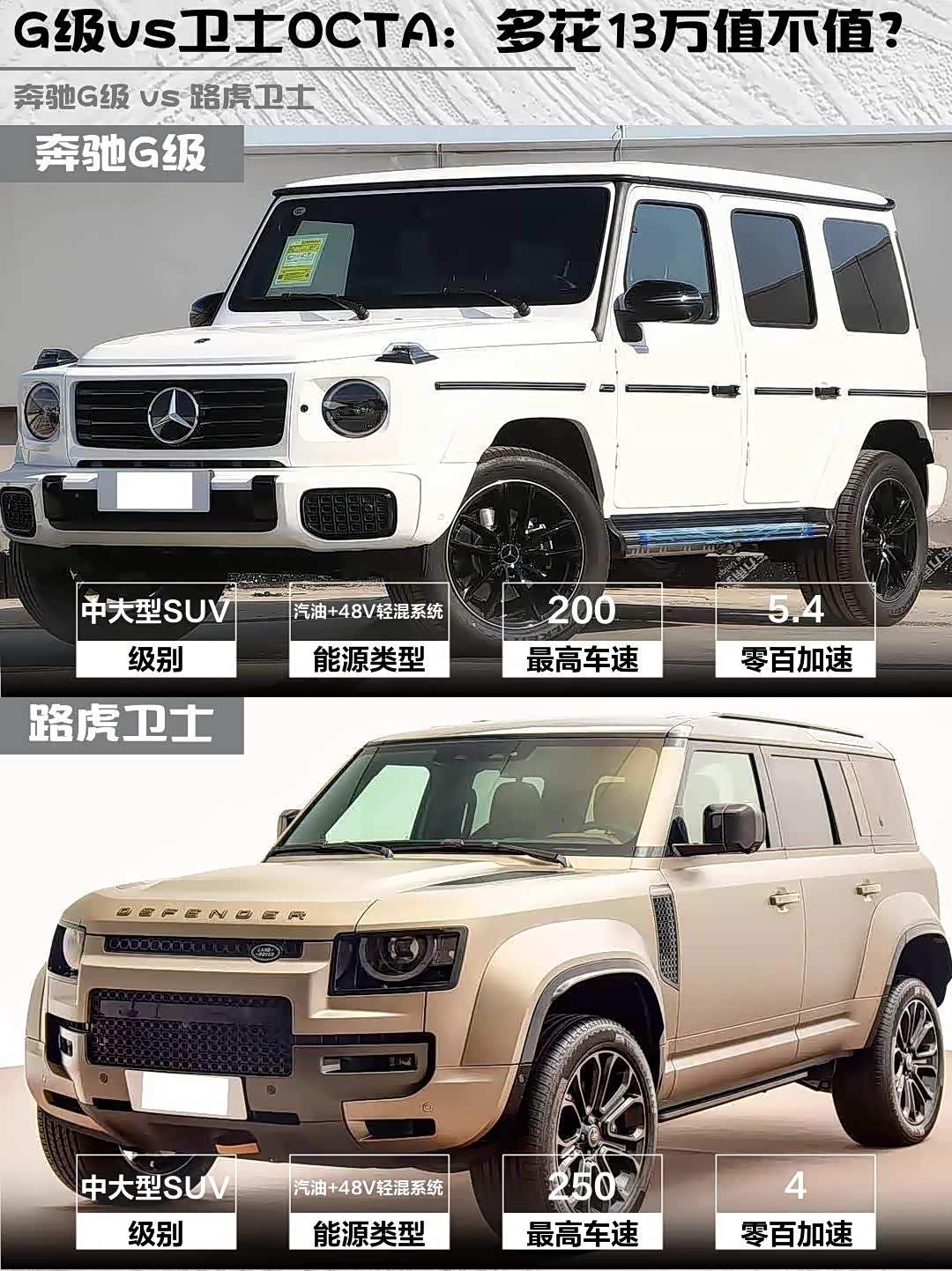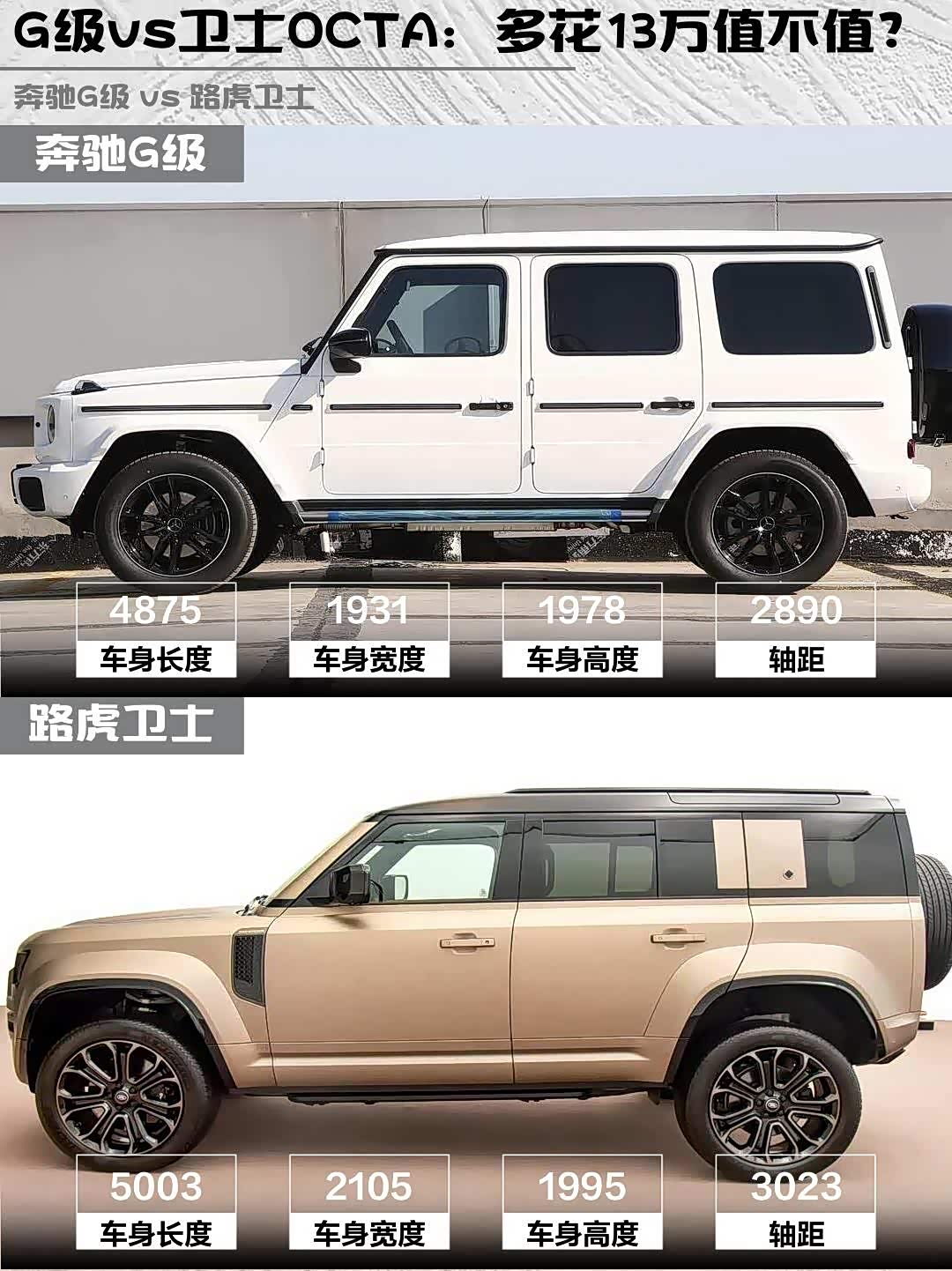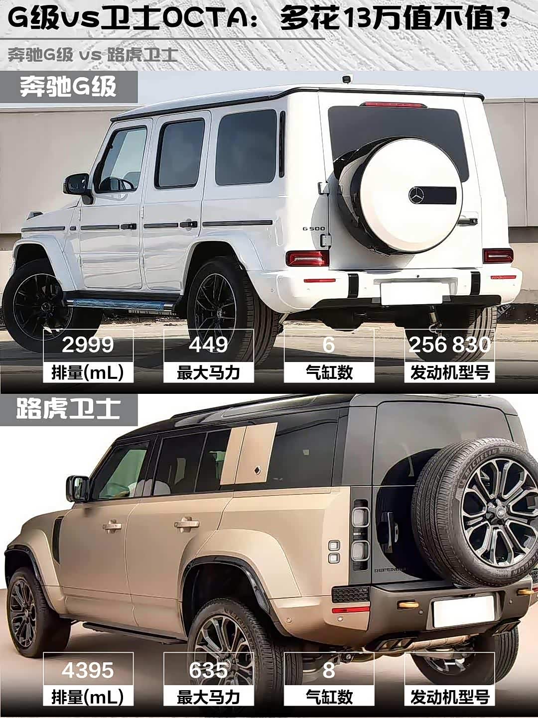 价格方面,G 500指导价186.8万,卫士110 OCTA 199.9万,相差13万左右。但G 500的选配更丰富,光是外观颜色就有30多种,哑光系列帅到炸裂!卫士目前只有砂岩金可选,略显单调。🎨