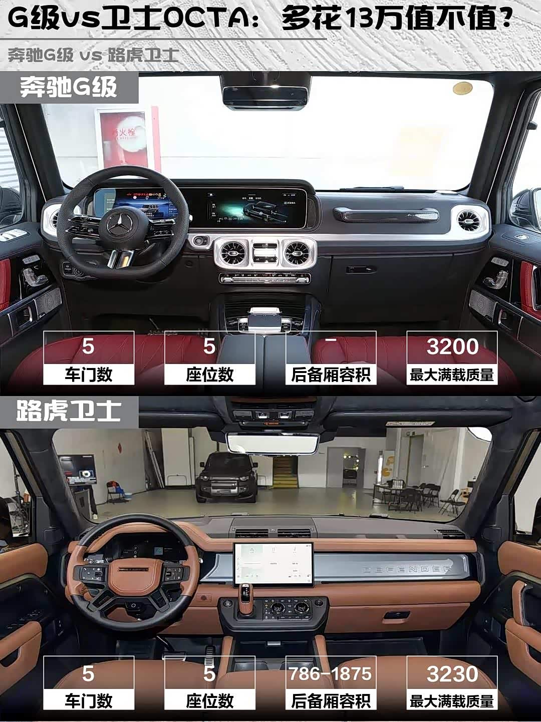 空间上,卫士110 OCTA车长超5米,后备厢容积786-1875L,完胜G 500。不过G 500的豪华感更突出,内饰用料扎实,双联屏设计+电动天窗,坐进去就是满满的尊贵感。卫士走的是硬核机械风,中控按键多但操作直观,适合喜欢纯粹越野的玩家。🛋️