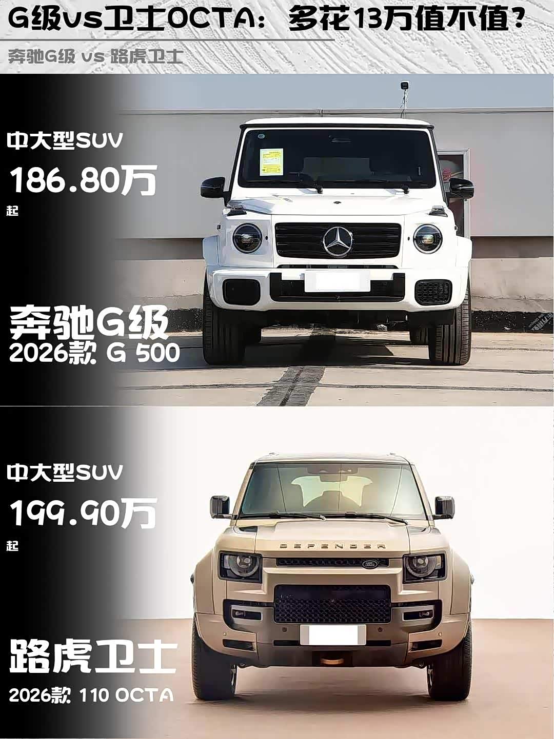 车家号·0浏览·2026-04-15 08:48 · 北京奔驰G级(参数|询价)和路虎卫士,这两台硬派越野界的顶流选手,到底谁更值得入手?今天就来一场实打实的对比!🔥