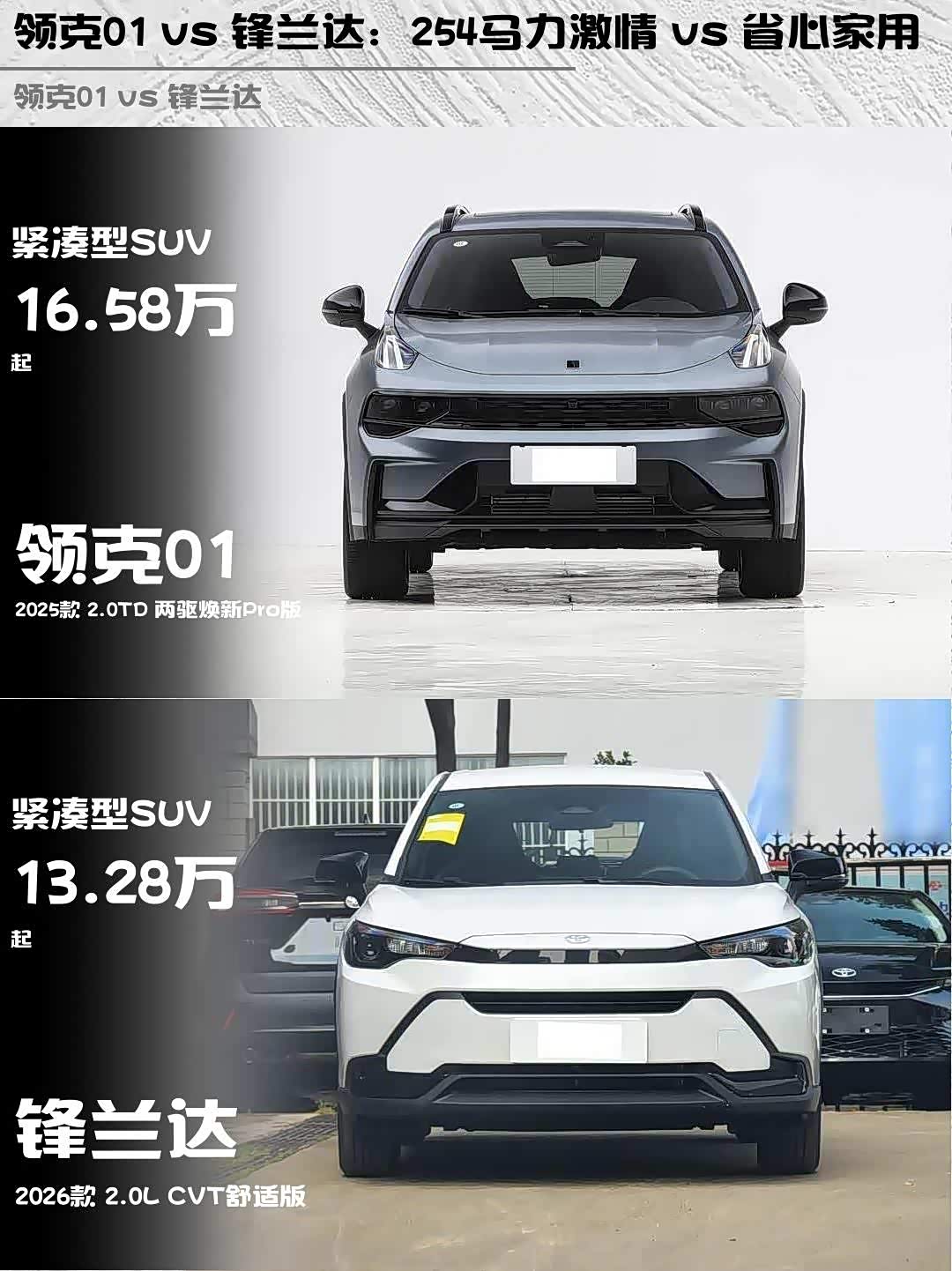 最近在选车的小伙伴看过来!今天给大家深度对比两款热门紧凑型SUV—— 领克01(参数|询价) 2025款 2.0TD 两驱焕新Pro版和锋兰达 2026款 2.0L CVT舒适版,看看谁更值得入手!🔥