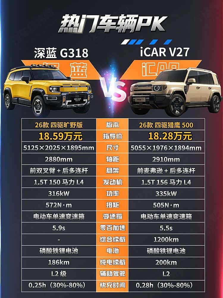新能源越野车是如今的热门车型,与传统的越野车相比,它们用车成本更低,舒适度更高,价格上也比较亲民,因此得到了大量用户的认可。2026年3月份就有多款车型登场,深蓝G318与 iCAR V27(参数|询价)都是其中比较有代表性的。