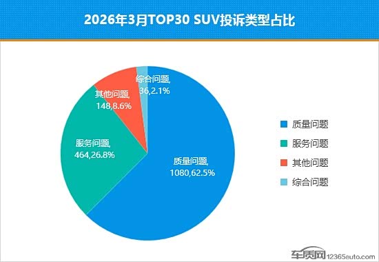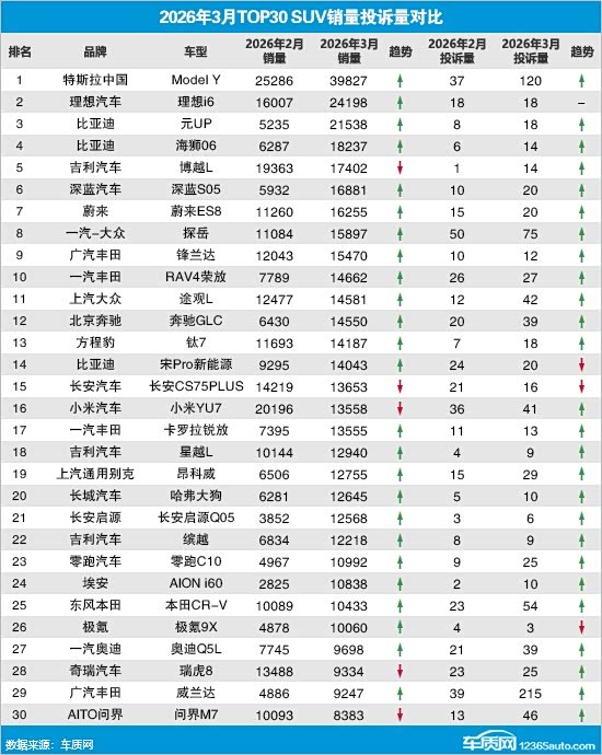 据行业综合销量数据显示,2026年3月国内SUV市场累计零售销量89.3万辆,环比上涨60.9%,同比下降5.9%。同期,车质网受理车主针对SUV的有效投诉6,918宗,环比上涨53.1%,同比下降27.5%。去除投诉人自愿申请撤诉的信息后,2026年3月TOP30 SUV销量投诉量排名如下: