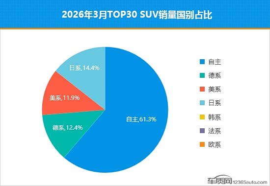 本月,自主品牌销量占比持续扩大,已超过总量的6成,环比提升2.6个百分点。德系品牌表现欠佳,入榜车型数量较上月明显减少,销量占比下降6.1个百分点。相比之下,韩系、法系及欧系品牌则始终未有车型跻身榜单。