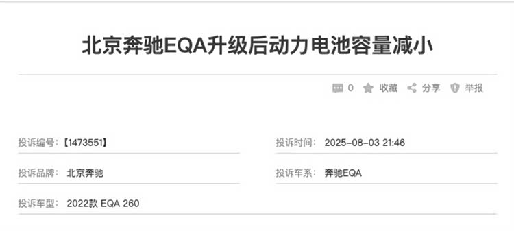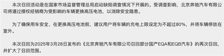 2021年,奔驰用一场上市发布会告诉消费者EQA是怎样一款车。2025年3月,奔驰用一份召回公告告诉车主它存在起火隐患、一个软件可以解决。2025年9月,车主用彼此转发的维权信息告诉奔驰,软件没有解决问题。2026年2月,奔驰用另一份召回公告承认需要换电池,并提示「停放在室外」。