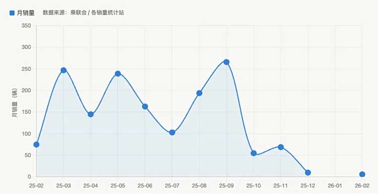 2025年9月卖了268辆,是它上市以来的近期高点。10月卖了55辆,单月跌幅79%。12月10辆。2026年2月,5辆。