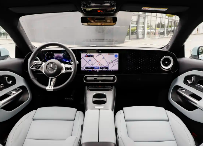 内饰和高配车型差不多,有全液晶仪表和中控屏组成的双联屏,副驾是满天星装饰面板,没副驾娱乐屏,风格简洁。车内有三幅式方向盘、电子怀挡和MB.OS智能座舱系统。还有101升前备厢,能提升载物能力。