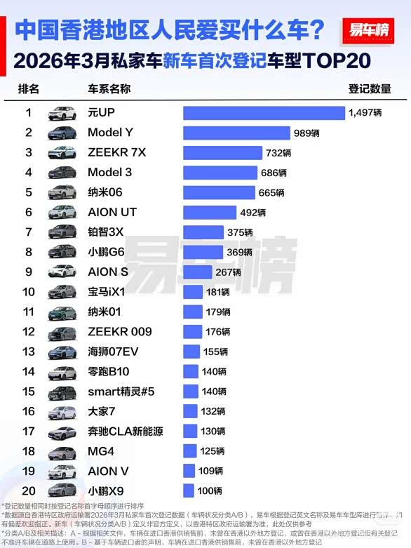 车家号·0浏览·2026-04-15 13:42 · 广东2026年伊始,比亚迪在香港市场捷报频传。易车榜数据显示,3月,比亚迪以1763辆的成绩登顶香港汽车市场全品牌销量榜首,其中元UP单车贡献1497辆,成为当月最畅销车型。
