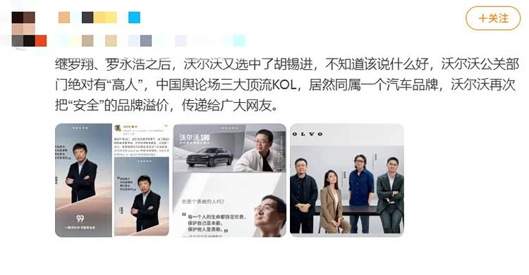 更有意思的是,99周年这次传播其实并不是“只有一个胡锡进”。公开页面显示,胡歌、周轶君、袁弘等也都参与了相关生日节点表达,内容整体仍然围绕“安全”“守护”“环境责任”这些更符合沃尔沃基调的关键词展开。也就是说,沃尔沃并不是没有更稳的内容、更顺的人物、更合适的叙事选项。可最后舆论偏偏把注意力几乎都集中到了最具争议性的那一位身上,这恰恰说明:对于安全品牌而言,争议人物并不会成为一块普通拼图,而极可能直接改写整张传播海报的重心。你以为自己只是加了一个“有声量的人”,市场感知到的却可能是“品牌开始变味了”。